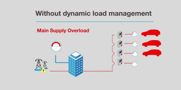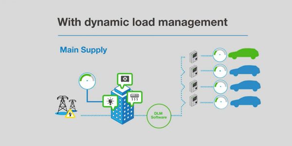 El sistema de gestión dinámica de potencia es una solución basada en software diseñada para gestionar la energía cuando varias estaciones de carga funcionan simultáneamente. La gestión dinámica de la carga permite cargar varios VE simultáneamente de la manera más eficiente posible utilizando la potencia disponible restante de forma dinámica y equilibrándola entre los cargadores de VE.